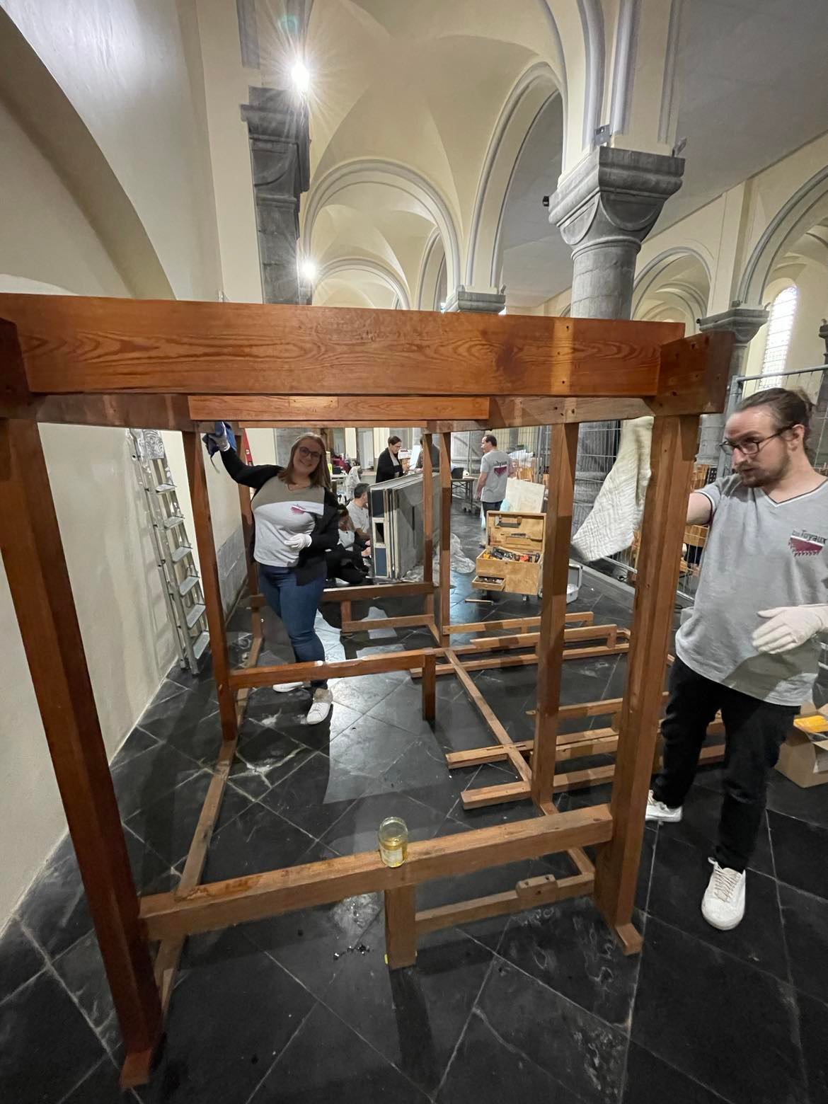 Quelques bois assemblés plus tard, l’équipe aura finalement reconstruit la structure principale de l’orgue, comprenant notamment « la semelle » qui concerne la partie à même le sol.