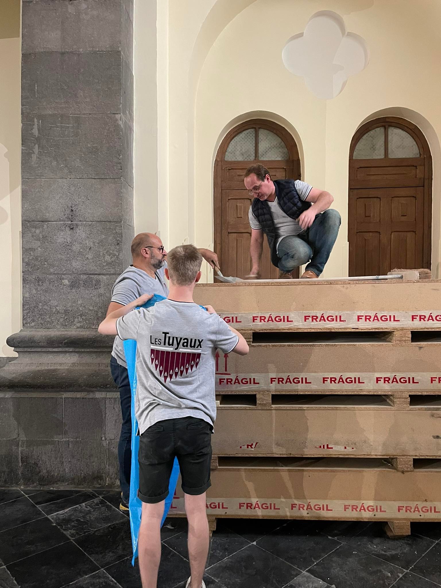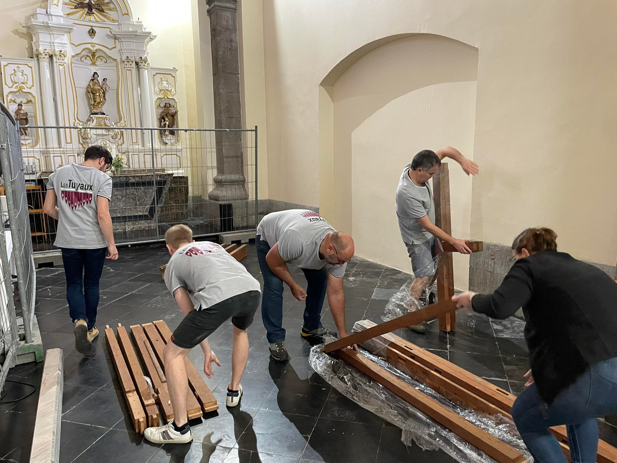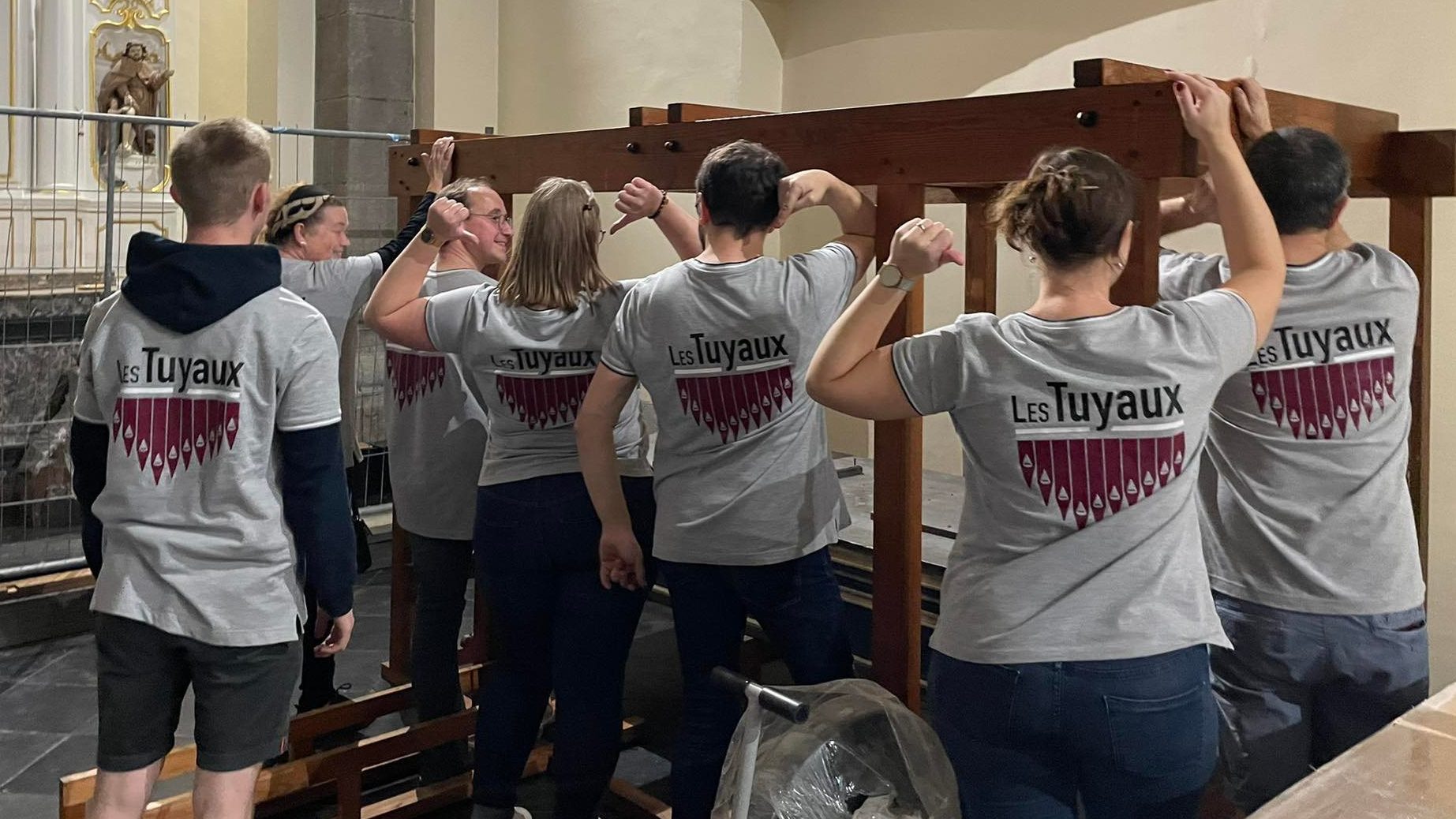 Remarquez qu’entre temps que les membres du projet collaboratif se sont munis d’un t-shirt de travail « Les Tuyaux ». Celui-ci vous permettra, lors de nos futures rencontres de démonstration, de savoir vers qui vous tourner pour avoir (dans la mesure du possible) des informations sur le chantier, sur l’orgue, ou sur le projet.