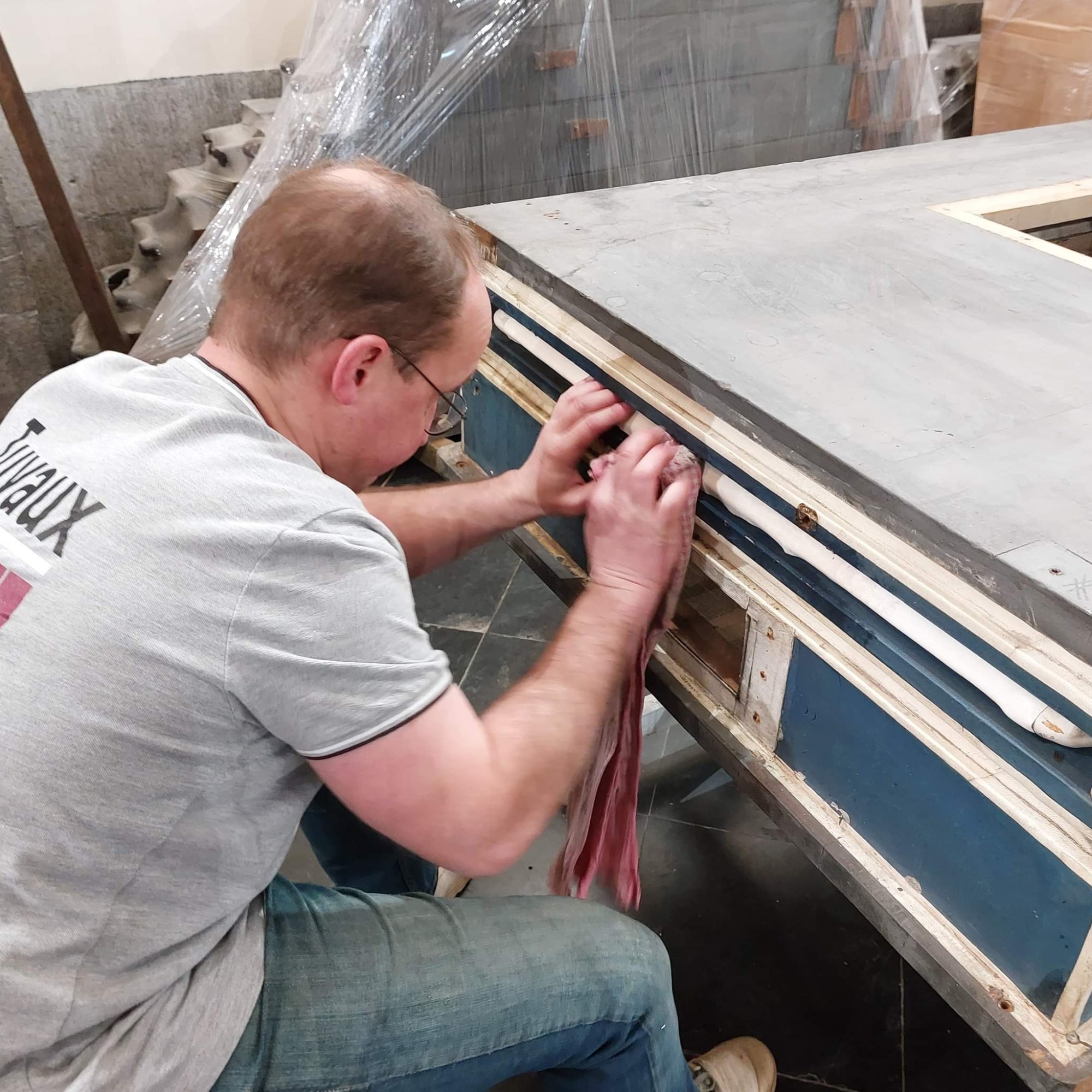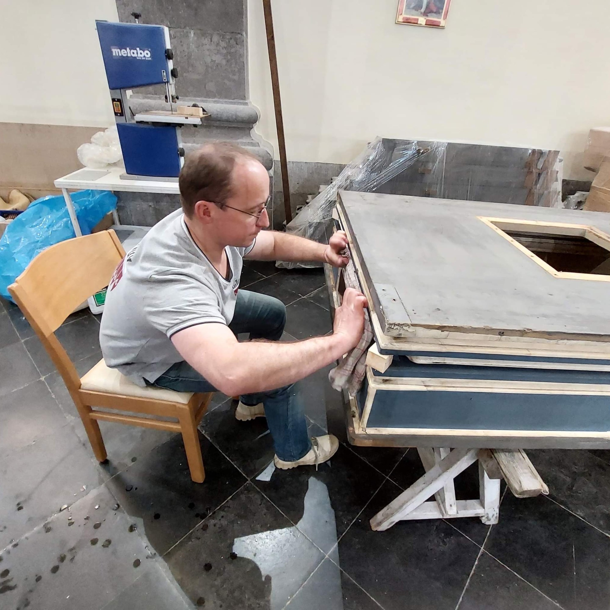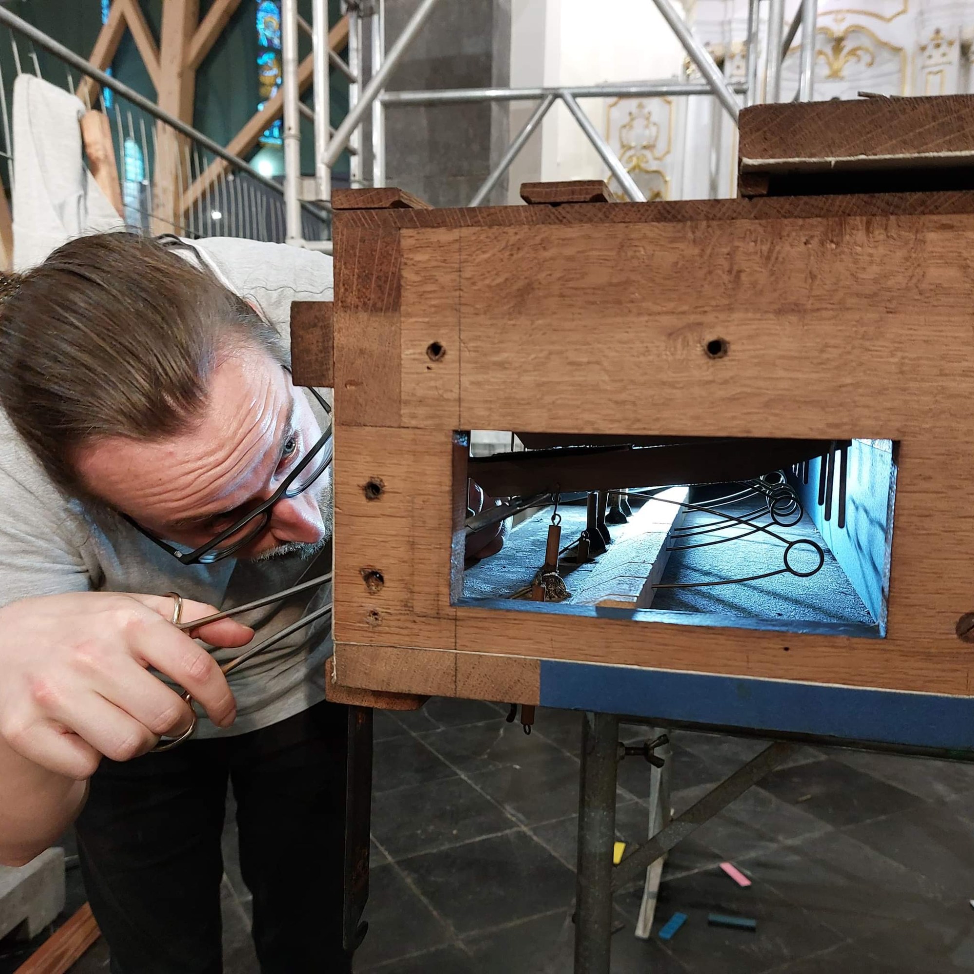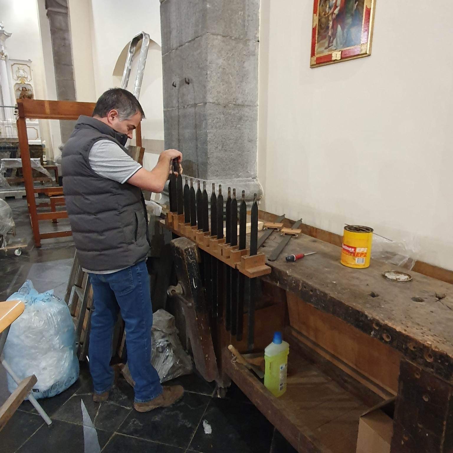 Ce poste lui était donc tout bonnement destiné. Désassembler les sabres et autres mécanismes semblait être un travail varié: entre l’entretien des boiseries, le graissage, et le coup d’éclat à la bombe aérosol, Patrick s’est attelé à quelques airs d’opéra en se laissant emporté par les musiques d’orgue qui animaient le chantier.